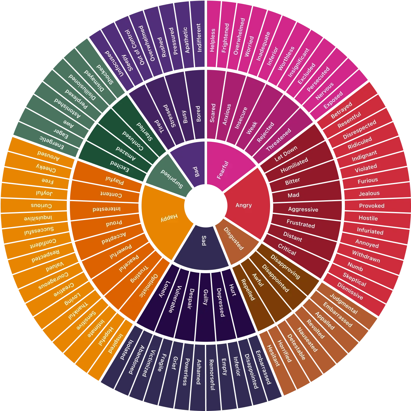 On the outer ring, the language gets even more precise. Instead of just “sad,” you may identify as lonely, guilty, or ashamed.
