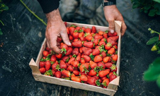 Visual: The farmer loads crates of strawberries onto a truck. Close-up of hands passing the crate to the driver.